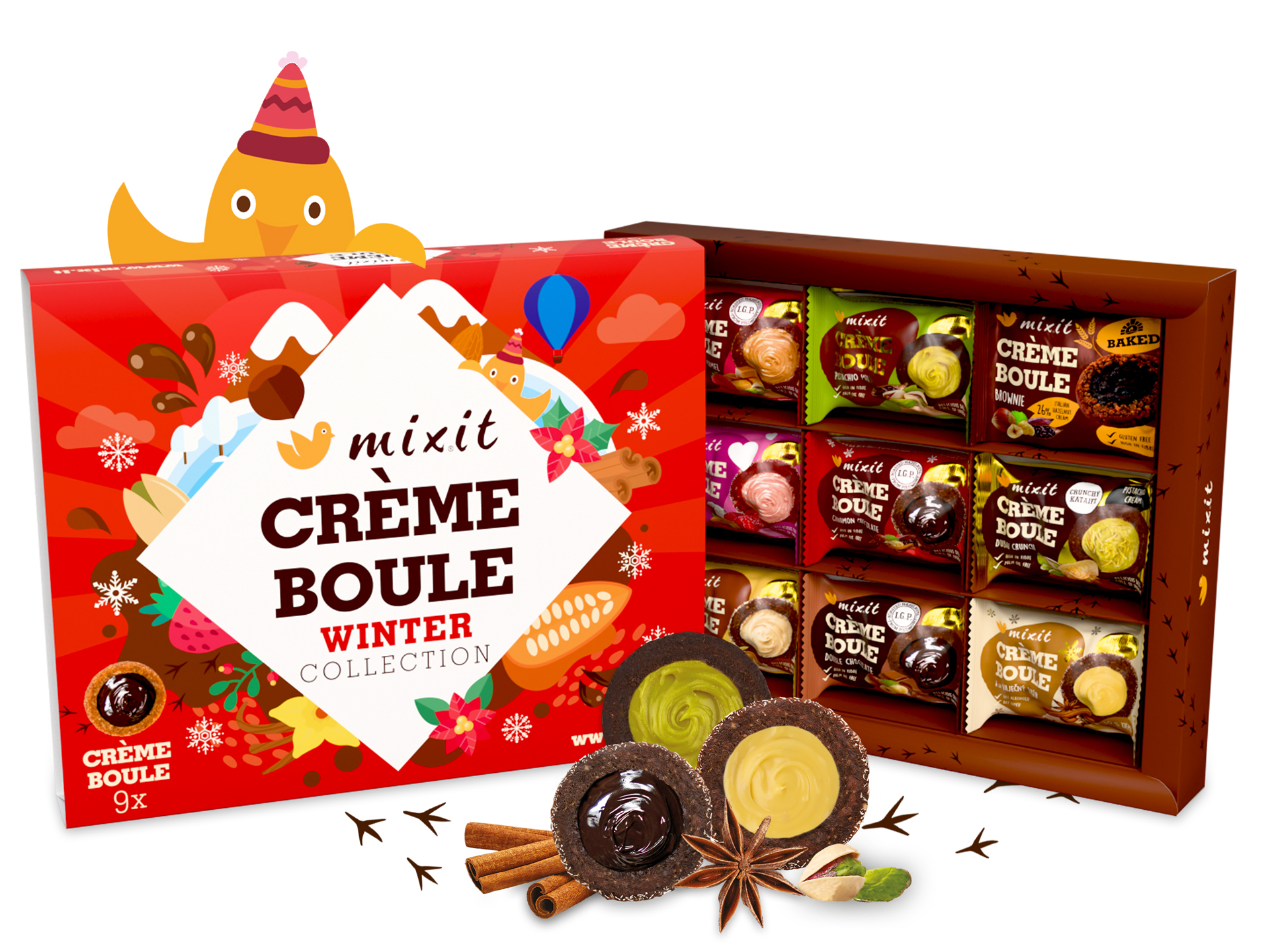 1x Crème boule – Dubai Crunch1x Crème boule – Strawberry Caramel1x Crème Boule – Love Berry1x Crème boule – Vanilla Date1x Crème boule – Double chocolate1x Crème boule – Pistachio Mio1x Pieczona Crème boule Pečená – Brownie1x Crème boule – Cinnamon Chocolate1x Świąteczna Crème boule à la ajerkoniak