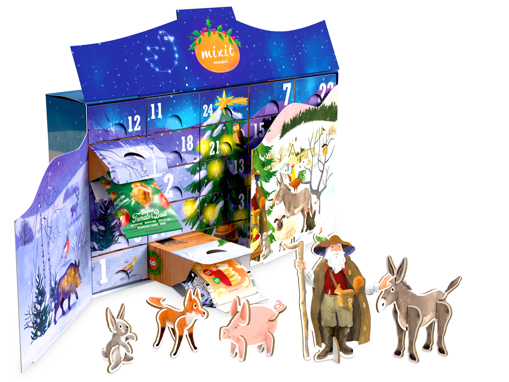 Ikona Świąt od Mixit powraca – i w tym roku jest bogatsza niż kiedykolwiek!Duży kalendarz adwentowy tradycyjnie kryje 24 okienka z 26 smakołykami – od sprawdzonych bestsellerów, przez świąteczne edycje limitowane, aż po nowości, które z pewnością pokochasz. A co w tym najlepsze? W tegorocznej edycji z motywem zwierzęcej farmy umieściliśmy najwięcej nowości w historii! Dwie specjalne niespodzianki czekają na Mikołajki i Wigilię, aby świąteczne chwile były jeszcze słodsze.